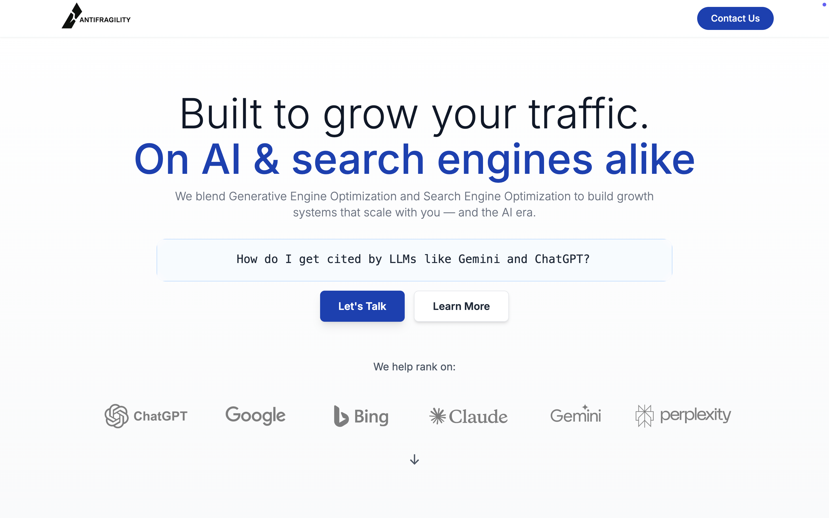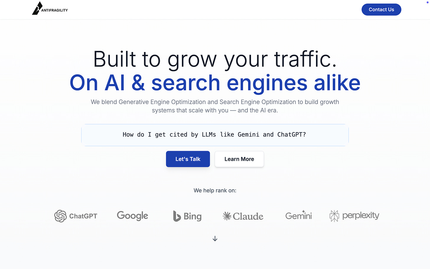 For the past 5 months now (since May), I’ve been running Antifragility Labs — an agency (turning) startup that helps businesses rank in both AI and search engines alike. More formerly known as GEO (generative engine optimization) and SEO (search engine optimization). I first started off as an agency acquiring clients like YC-backed startups, e-commerce businesses, well-known podcasts, and pretty big VC firms.